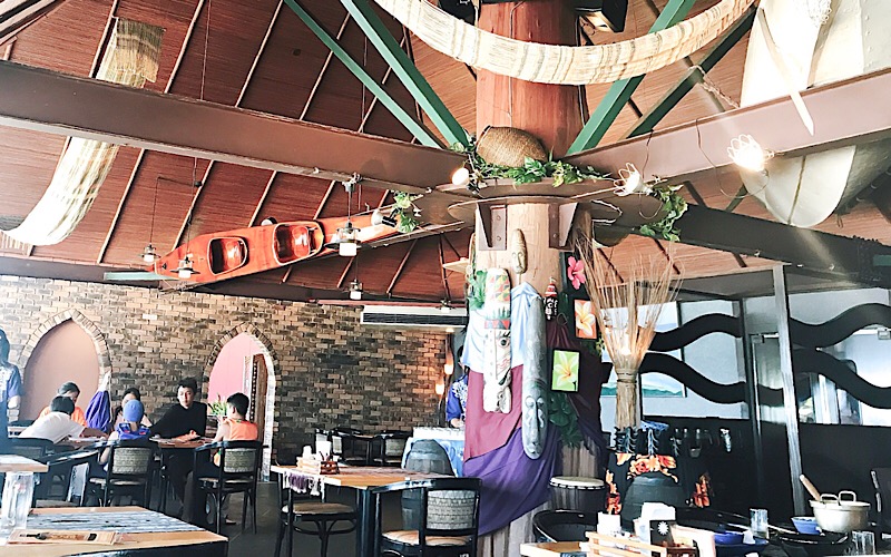 店内は高天井にすだれ(?)やカヌーボートが飾られていて、南国らしい涼しげなつくりになっています。