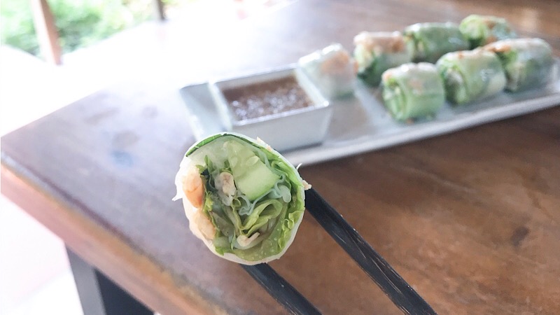 海老、レタス、きゅうりが入っており、ピーナッツソースでいただきました。ベトナムの生春巻きよりもヘルシーな味付けです。