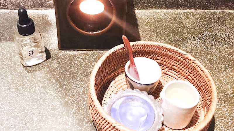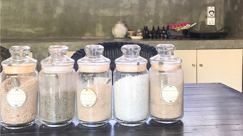 マッサージ用のハーブのスクラブが置いてありました。ここから個人の好みに合わせて調合してるんだろうな。