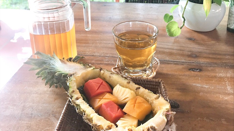 しっかりとマッサージを受けたあとは、またお庭に戻りお茶タイムを。新鮮なフルーツと冷たいお茶をいただきます。
